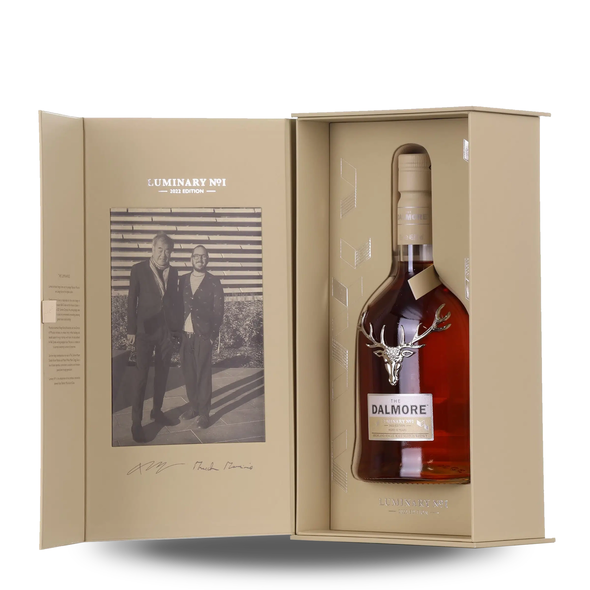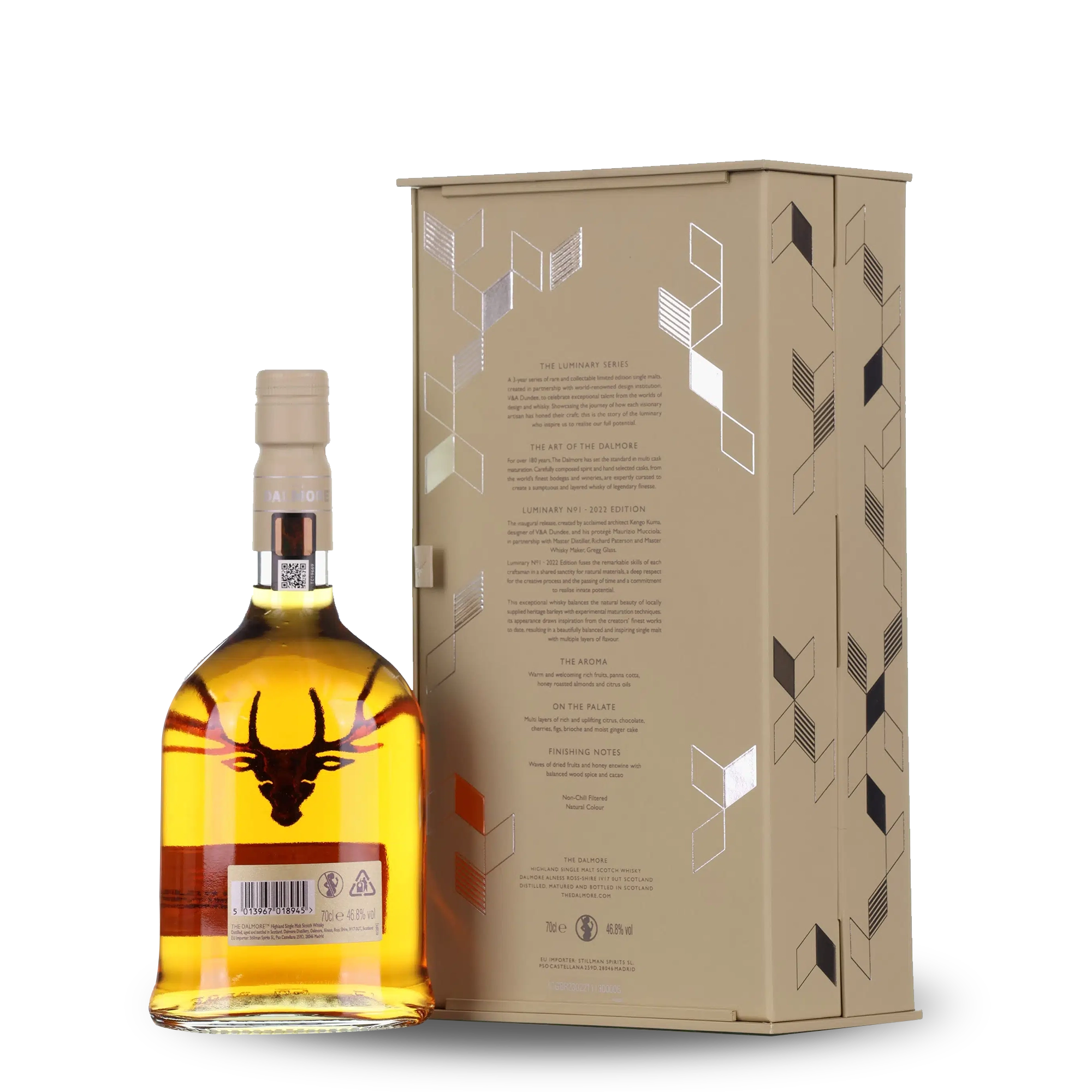 The first of a three part series of limited edition single malts created by luminaries from the worlds of whisky and architectural design, curated in partnership with the V&A Dundee. Co-conceived by architect Kengo Kuma, the designer of the iconic V&A Dundee and his protégé Maurizio Mucciola, with Master Distiller, Richard Paterson OBE and Master Whisky Maker, Gregg Glass. This first bottle is 15 years old, matured in American white oak, finished in Amarone red wine casks and bespoke Kintsugi casks made up of Scottish tay, Japanese and American white oak casks.